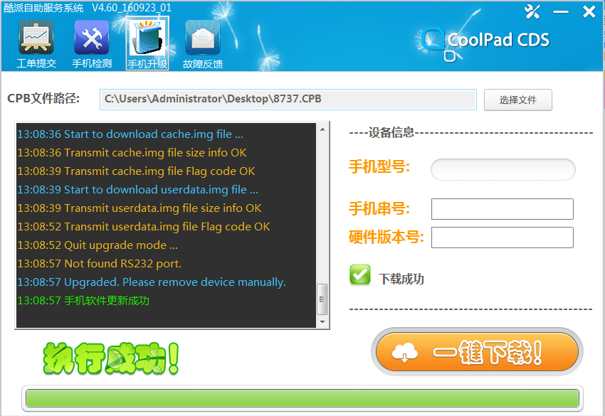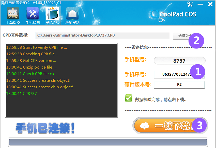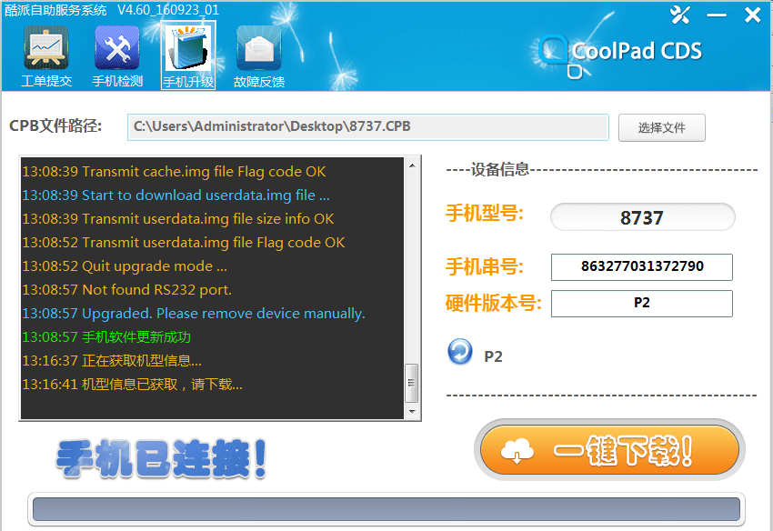 1. 手机开机状态下连接数据线,CDS检测到后自动读取到机型信息,然后选择升级版本(载入CPB刷机包)