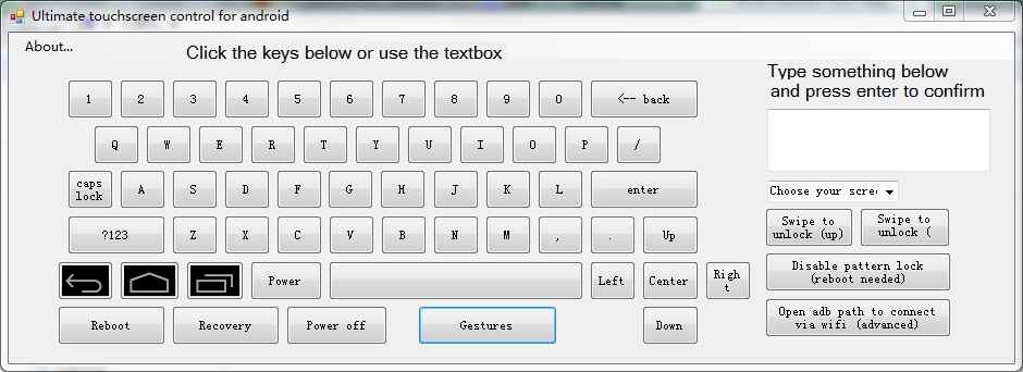 在窗体“Ultimate touchscreen control for android”中点击按键“Gestures” 会弹出新窗口“Gestures”,窗体中间部分是透明的,设置正确的手机分辨率(Resolution)后,将窗口移动到投影手机屏幕内容的窗口上面,直接用电脑鼠标点击或者拖曳就可以“触摸”到你的手机了。