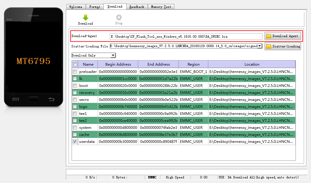 - 手机关机后,需要同时按住「音量上+音量下」,等待SP Flashtool 响应后(黄色进度条出现)才松开,否则你可能会遇到错误:s_brom_download_da_fail。